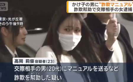 NEW!!「かけ子」などをしていた交際相手に詐欺のマニュアルを送り、詐欺を幇助(ほうじょ)したとして23歳の女が逮捕されました。 高岡莉優容疑者は去年、…