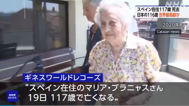 2つの世界大戦を生き抜き、世界最高齢と認定されていたスペイン在住の117歳の女性が亡くなり、アメリカの研究グループは、日本の116歳の女性が新たに世界最高齢になったとみられるとしています。