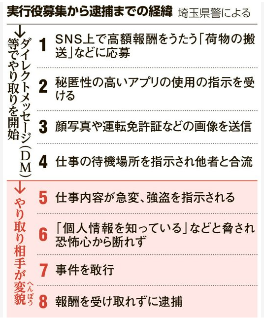 東京、埼玉両都県で相次いだ強盗致傷事件で、同県の所沢市の事件で逮捕された実行役とみられる男が、闇バイトに応募し、「指示役から逃げたら殺すと言われ、強盗をせざるを得なかった」という趣旨の供述をしていることが、埼玉県警と警視庁の共同捜査本部への取材で分かった。