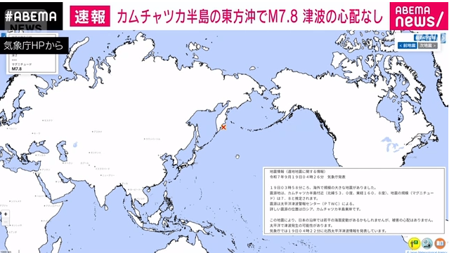 ロシア・カムチャツカ東方沖でM7.8 気象庁「日本への津波被害なし」
