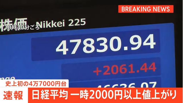 日経平均株価が一時2100円以上値上がり 史上初の4万7000円台 総裁選で高市氏が勝利し政策に期待感