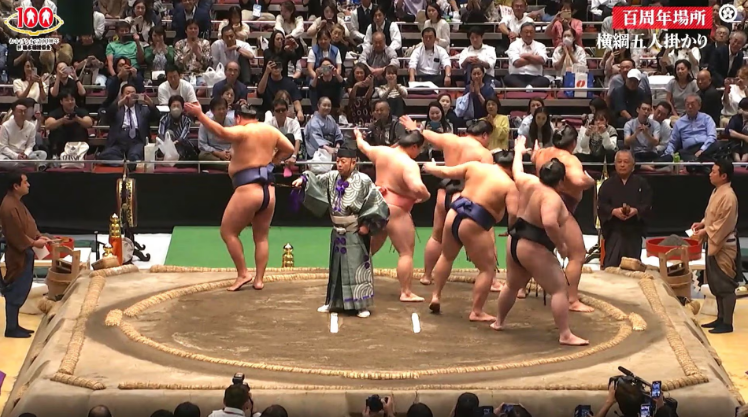呼出による力士の紹介を終えると、拍手が響く。と次の瞬間、西方の五人衆がフォーメーションのように隊列を組んで仕切り動作を始めると、館内がどよめき、その不思議な光景に笑いも起こった。
