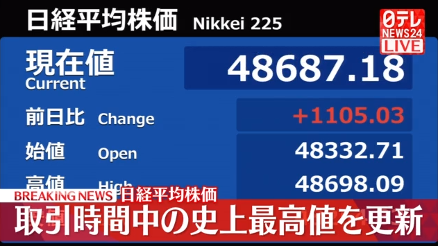 20日朝の東京株式市場で日経平均株価は、10月9日につけていた4万8597円を上回り、取引時間中の史上最高値を更新しました。 市場では、自民党と日本維新の会が20日、連立をめぐる合意文書に署名し、21日に行われる首相指名選挙では、高市総裁が次の首相に選ばれる公算が大きくなっているとの見方が広がっています。 この影響を受け、東京株式市場は取引開始直後から買い注文が多く入りました。 三井住友DSアセットマネジメントの市川雅浩ストラテジストは、今後の見通しについて「安定的な政権運営などが行えれば、株価の上昇傾向は続く」と分析しています。
