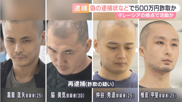 詐欺の疑いで再逮捕されたのは、住居不定で無職の葛籠匡矢容疑者(25)や脇勇気容疑者(30)ら男4人です。