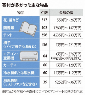 ◇備品、設備など幅広く  物品の内訳は、花や苗などが613件と最も多く、金額の幅は550円~26万円だった。次いで図書類が403件、1360円~147万円。テント(256件、4235円~233万円)、椅子(136件、1万円~221万円)、エアコン・空調機(64件、4万円~376万円)やカーテン(60件、1万円~129万円)なども多かった。門扉(164万円)の寄付を受けた小学校もあった。100万円以上の現金、印刷機のインキ、シールといった消耗品もあった。