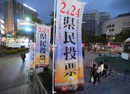那覇市内に立てられたのぼり=23日午後 沖縄県民投票では、半数が投票に行かなかった。「賛否…
