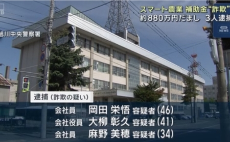 農水省の補助金およそ880万円をだまし取ったか…会社員の男(46)ら男女3人を逮捕 旭川市