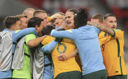 © スポーツニッポン新聞社 UAEに競り勝ち喜ぶオーストラリア代表(AP) ◇W杯カタール大会アジア予選5位決定プレーオフ オーストラ…